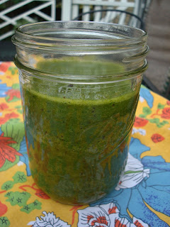 Green Gazpacho, on the other hand is spicy and flavorful. I start with fresh salsa, lime juice and a Serrano chili. An entire bunch of cilantro adds bite and is a great for detoxification. The greens and veggies vary depending on what is fresh and available so be creative. I like to make them when I've already got the Vitamix out to make salsa and just leave a couple of inches of salsa in the blender. All I have to do is keep filling up the blender.